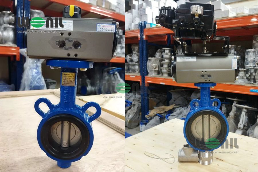 - Van bướm điều khiển khí nén: Là loại van sử dụng áp lực khí nén để điều khiển cánh van xoay một góc từ 0 đến 90 độ. Loại van này thường dùng để đóng/mở nhanh và điều tiết lưu lượng trong các hệ thống lớn.